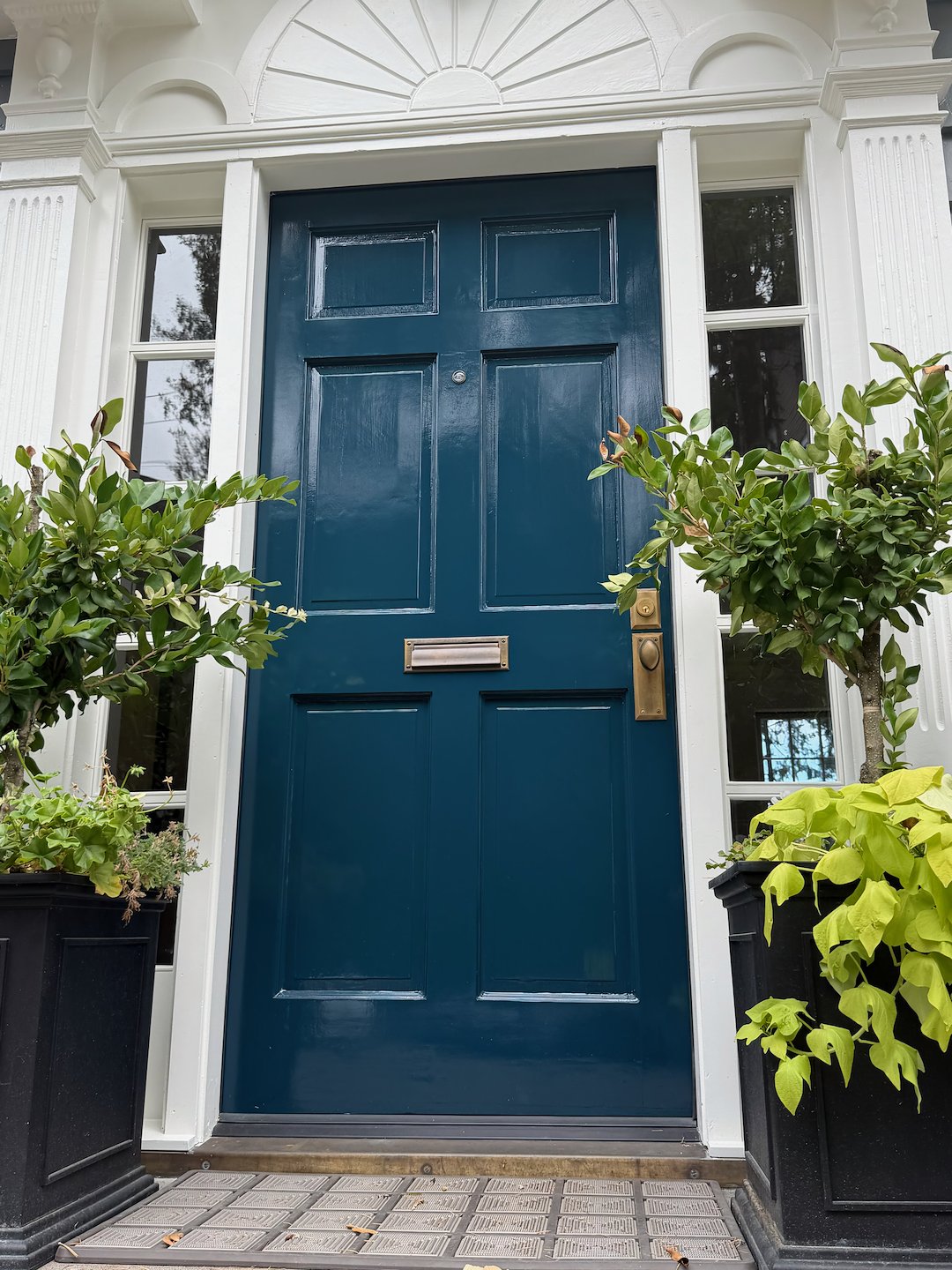 The front door became the star of the design: finished in Farrow & Ball Hague Blue (FB 30) in a Full Gloss sheen. This deep, timeless blue adds a sophisticated contrast and pays homage to classic Dutch and British design traditions, harmonizing perfectly with Portland’s natural, moody light.